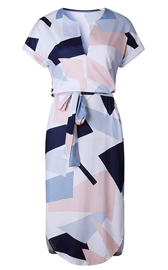 Womens Dresses Summer Casual V-Neck Floral Print Geometric Pattern Belted Dress