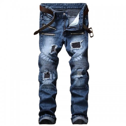 Men's Pleated Biker Jeans Pants Slim Fit Brand Designer Motocycle Denim Trousers For Male Straight Washed Multi Zipper