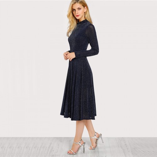 A Line Ladies Dresses Navy Long Sleeve Mock Neck Glitter Fit abd Flare Dress Stand Collar Elegant Party Dress