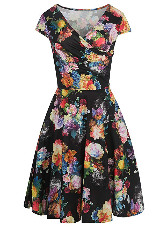 Women's V-Neck Cap Sleeve Floral Casual Work Stretch Swing Dresses