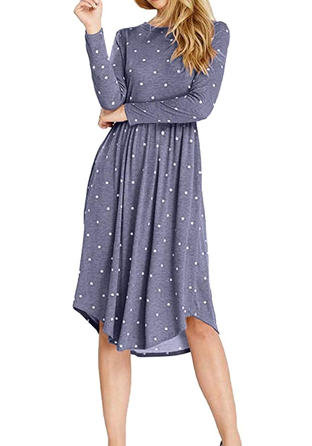 Women Long Sleeve Pleated Polka Dot Pocket Swing Casual Midi Dress