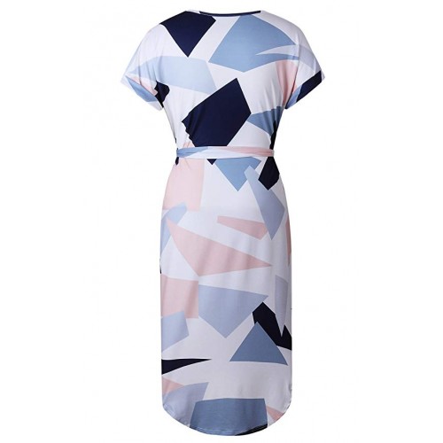 Womens Dresses Summer Casual V-Neck Floral Print Geometric Pattern Belted Dress