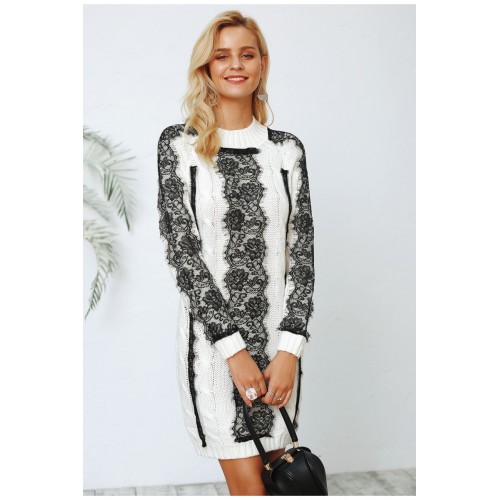 • Neck twist knitted sweater dress women Elegant lace autumn winter dress 2018 Vintage long sleeve mini dress