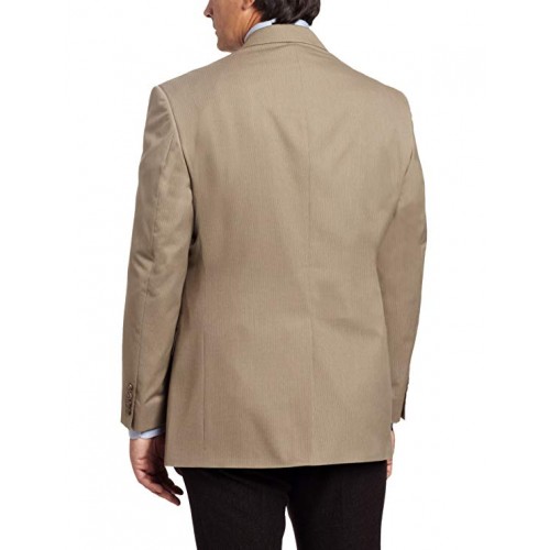 Two-button suit jacket featuring notched lapel and welt pocket at left chest